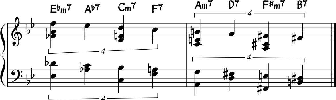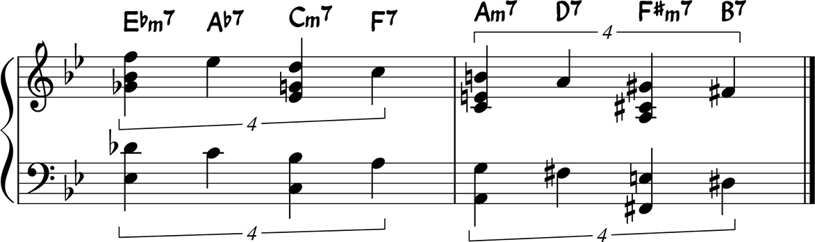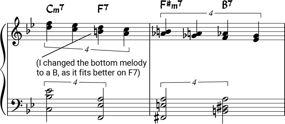 Let’s start with what Evans actually plays. This is a ii-V in B♭ major, so Cm7 – F7: